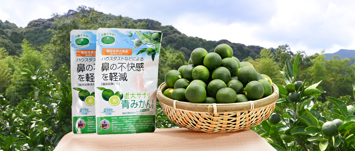 (株)ア・ファーマ近大では、平成16年(2004年)の創業以来、近畿大学薬学部薬用資源学研究室の研究成果に基づき、夏に早摘みした和歌山県産温州みかんを使用した「近大サプリ 青みかん」を製造・販売しております。